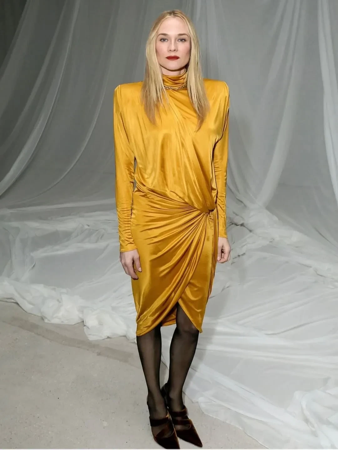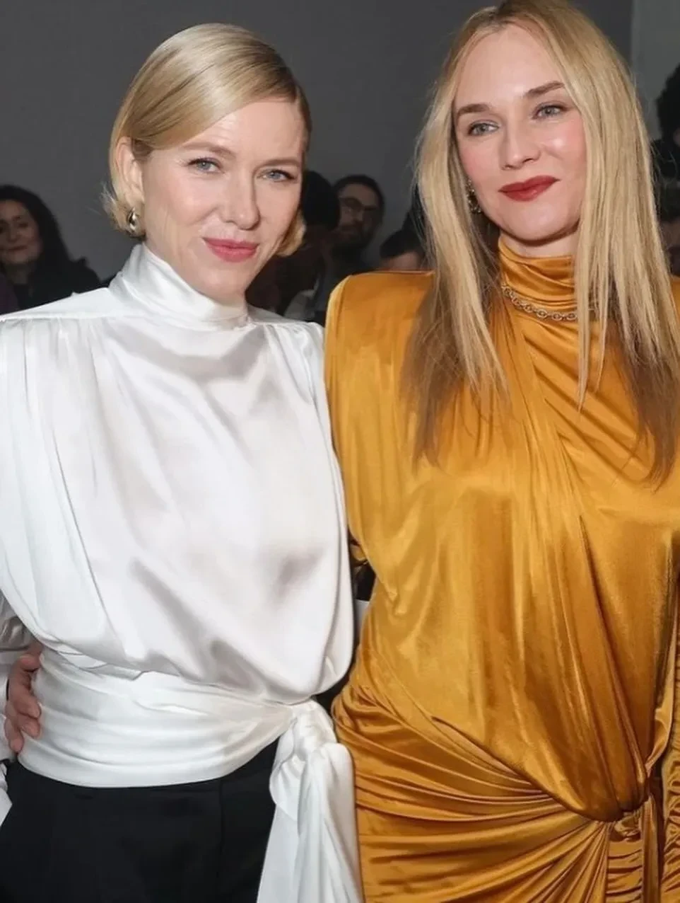Рози Хантингтон-Уайтли57-летняя Наоми Уоттс и 49-летняя Диана Крюгер встретились на шоу Balmain. Уоттс пришла в белой блузе с квадратными плечами и узких брюках, а Крюгер позировала в жёлтом платье и чёрных колготках.