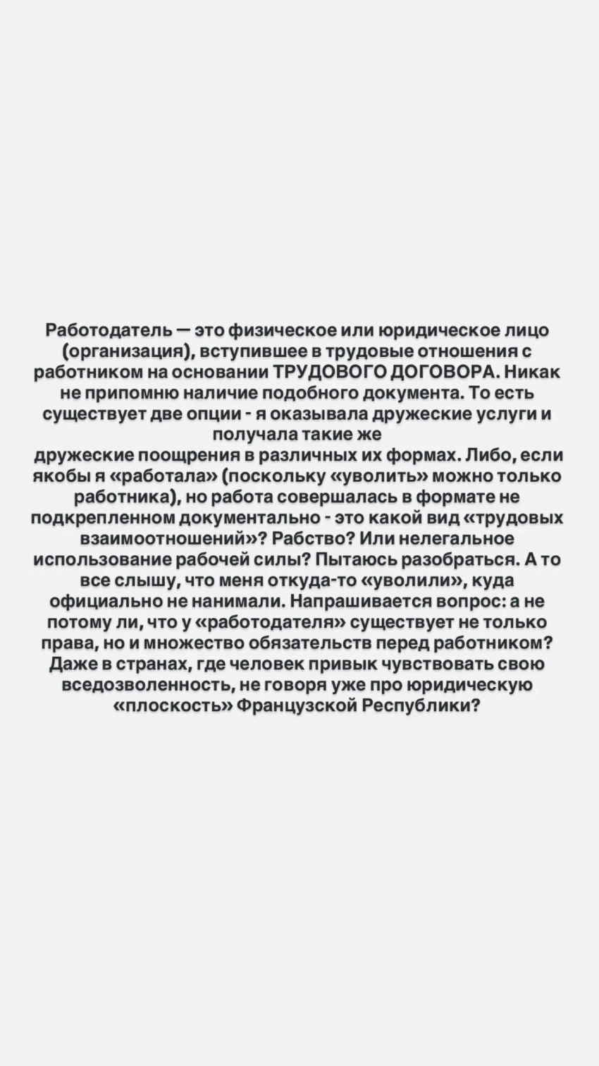 В своём инстаграме* Максимова заявила, что в период работы на Литвинову у неё не было официального трудового договора, то есть фактически она работала незаконно: "Никак не припомню наличие подобного документа. То есть я оказывала дружеские услуги и получала такие же дружеские поощрения. Работа совершалась в формате, не подкреплённом документально. Это какой вид "трудовых взаимоотношений"? Рабство? Или нелегальное использование рабочей силы?" — публично поинтересовалась она, намекнув, что готова искать правды в суде.
