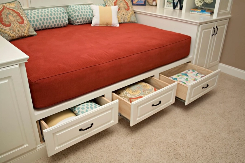 • Кровать с выдвижными ящиками для белья, сезонной одежды и обуви.