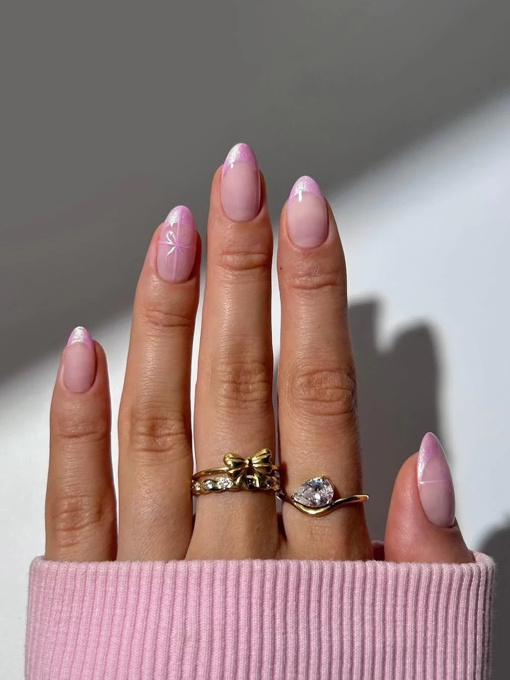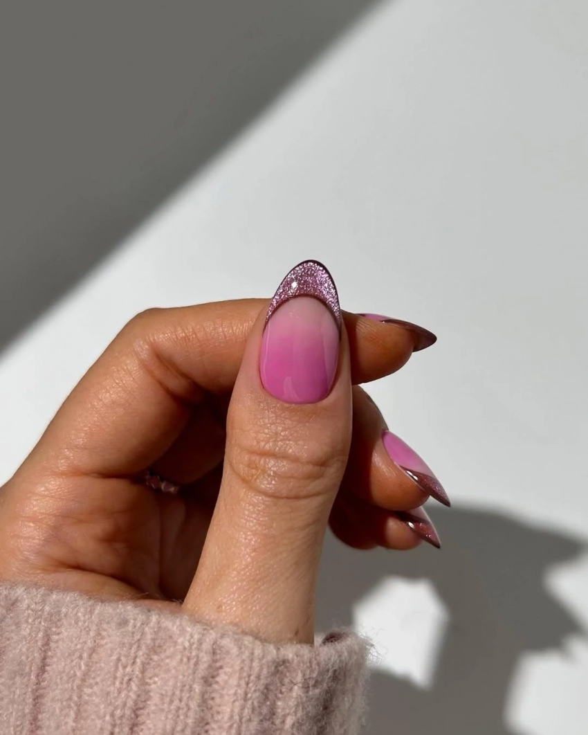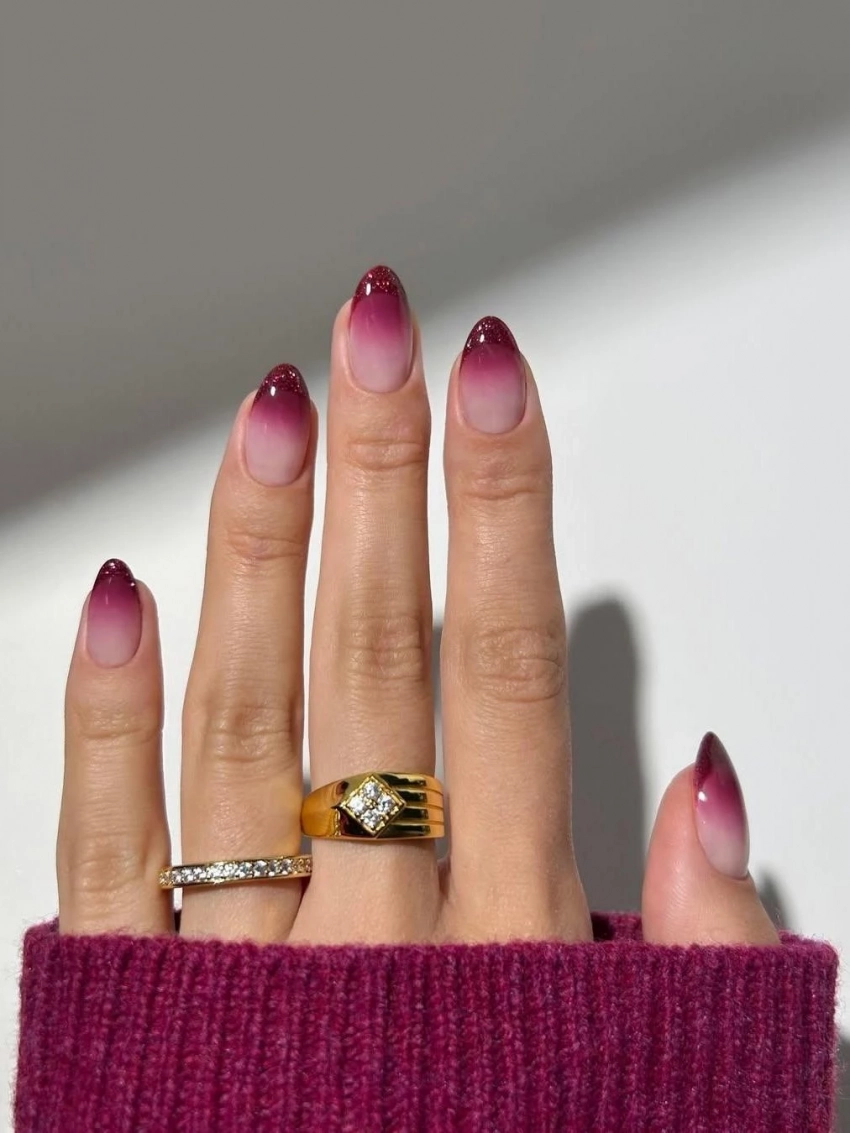 Этот дизайн напоминает предыдущий, но с обратным эффектом: цветовая растяжка идет не от кончиков, а от основания ногтя. В сочетании с блестящим френчем он выглядит торжественно и элегантно, создавая особенное сияние.
