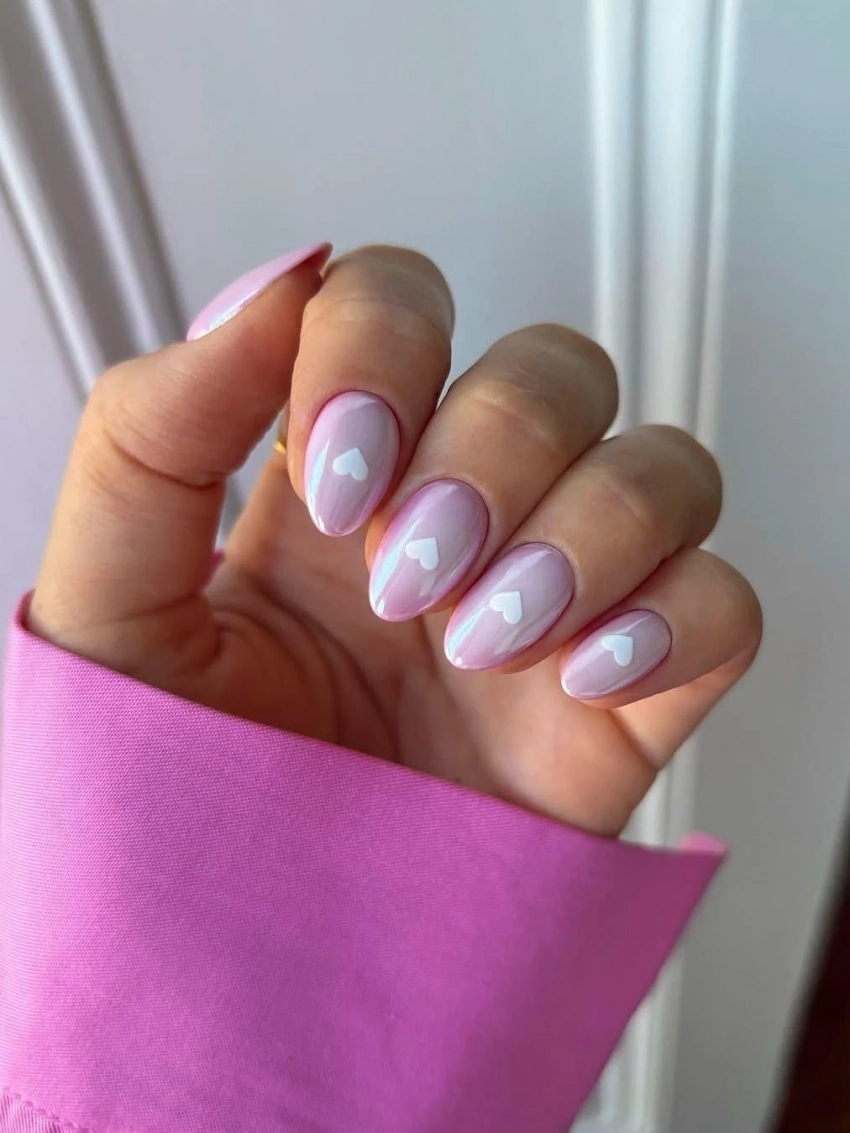 Хромированный маникюр остается в тренде и в 2025 году. Особенно эффектно он смотрится в нежно-розовом цвете с хромированными сердцами. Такой дизайн идеально передаст романтическое настроение и сделает образ более игривым.