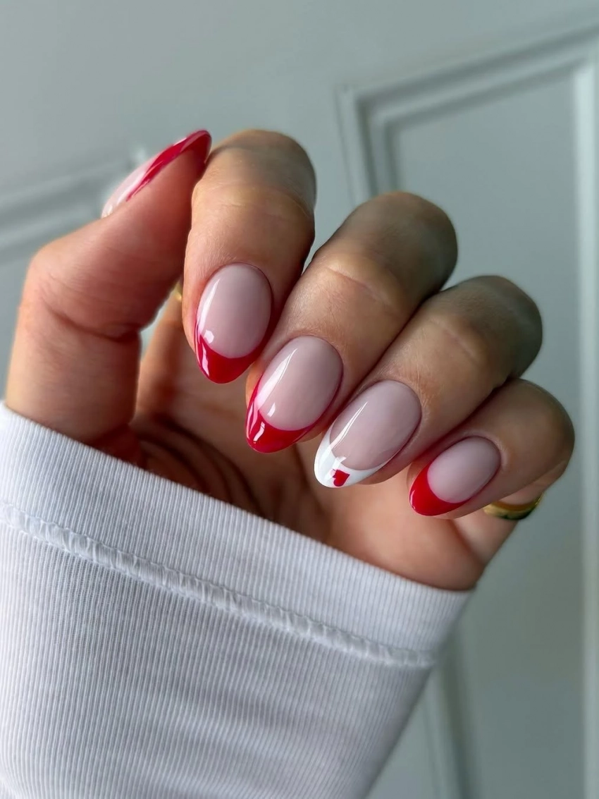 Красный цвет — символ страсти и любви, поэтому на День святого Валентина без него не обойтись. Вместо классического красного покрытия попробуйте желейные ногти, напоминающие мармелад или клубничный джем. Дополните дизайн молочными мини-сердцами для еще большей выразительности.
