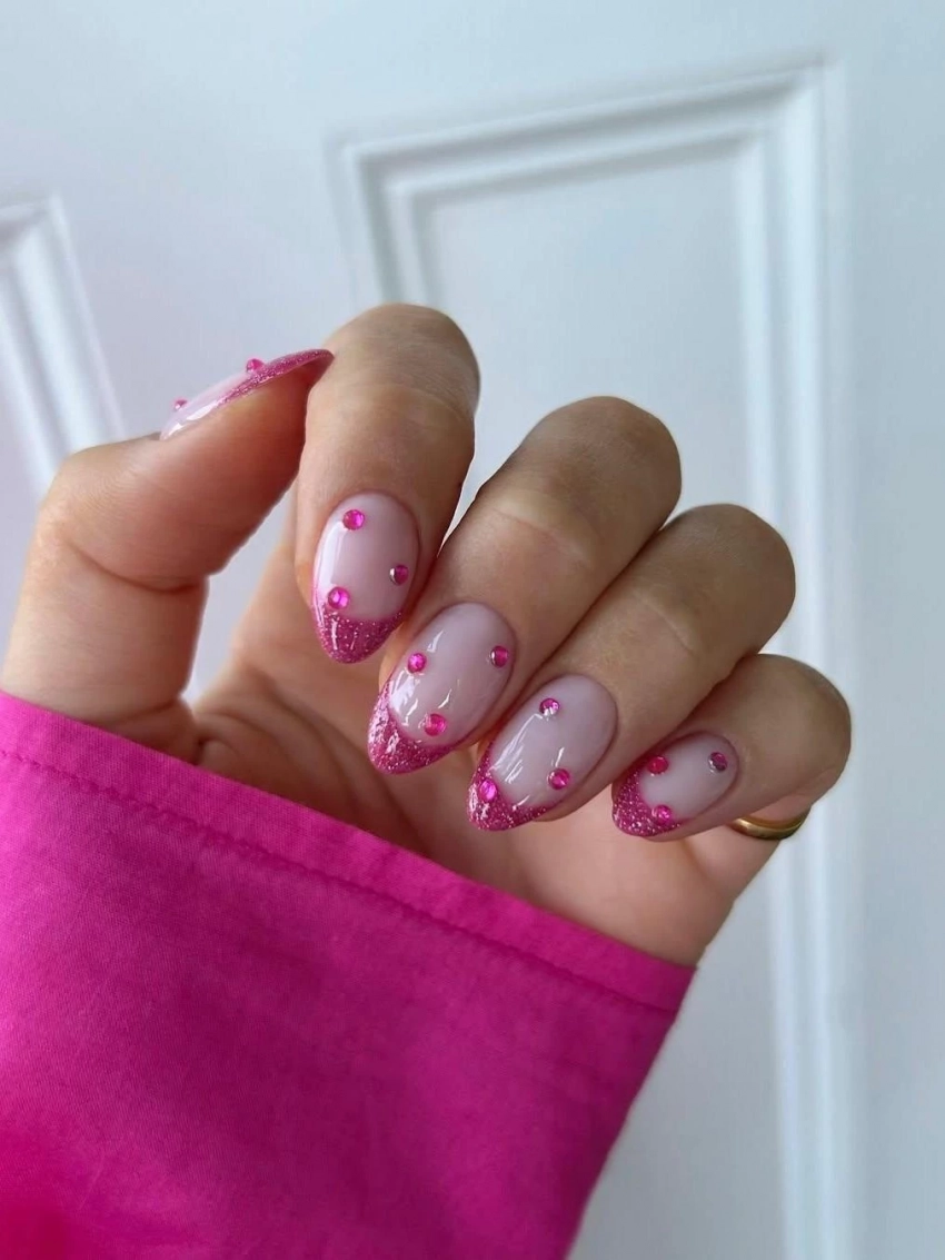 Романтичный розовый френч с небольшими стразами выглядит нежно и элегантно. Просто нанесите перламутровый розовый лак на кончики ногтей и украсьте их 2-3 кристаллами на каждом пальце.