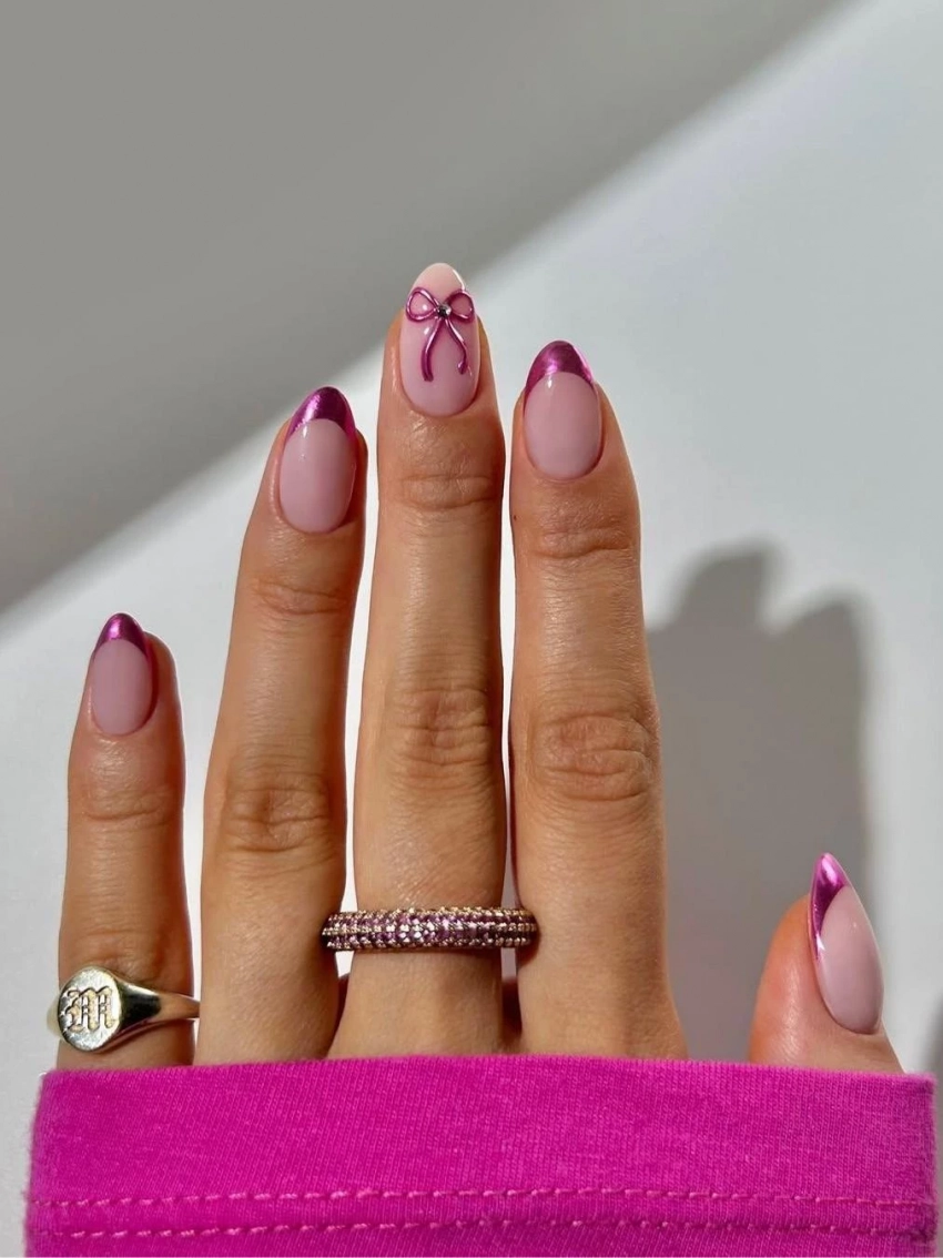 Этот маникюр сочетает в себе кокетливость и элегантность. Хромированный френч с изящными бантиками на средних ногтях идеально подойдет для девушек, предпочитающих романтические образы. Он будет отлично смотреться с воздушными платьями и женственными блузами.