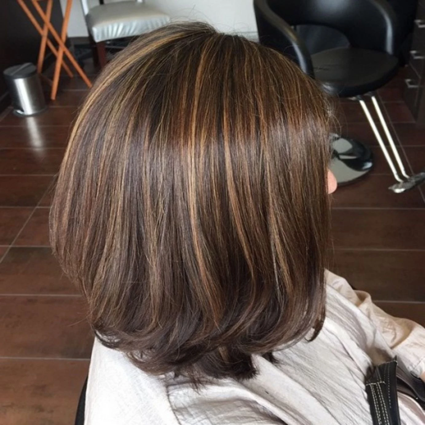 Тёмные волосы с тёплым коньячным отливом придают коже здоровый румянец и сияние. Главное — сбалансированный оттенок без уводов в рыжину. Мягкое мелирование добавляет объём и делает образ более динамичным и молодым.