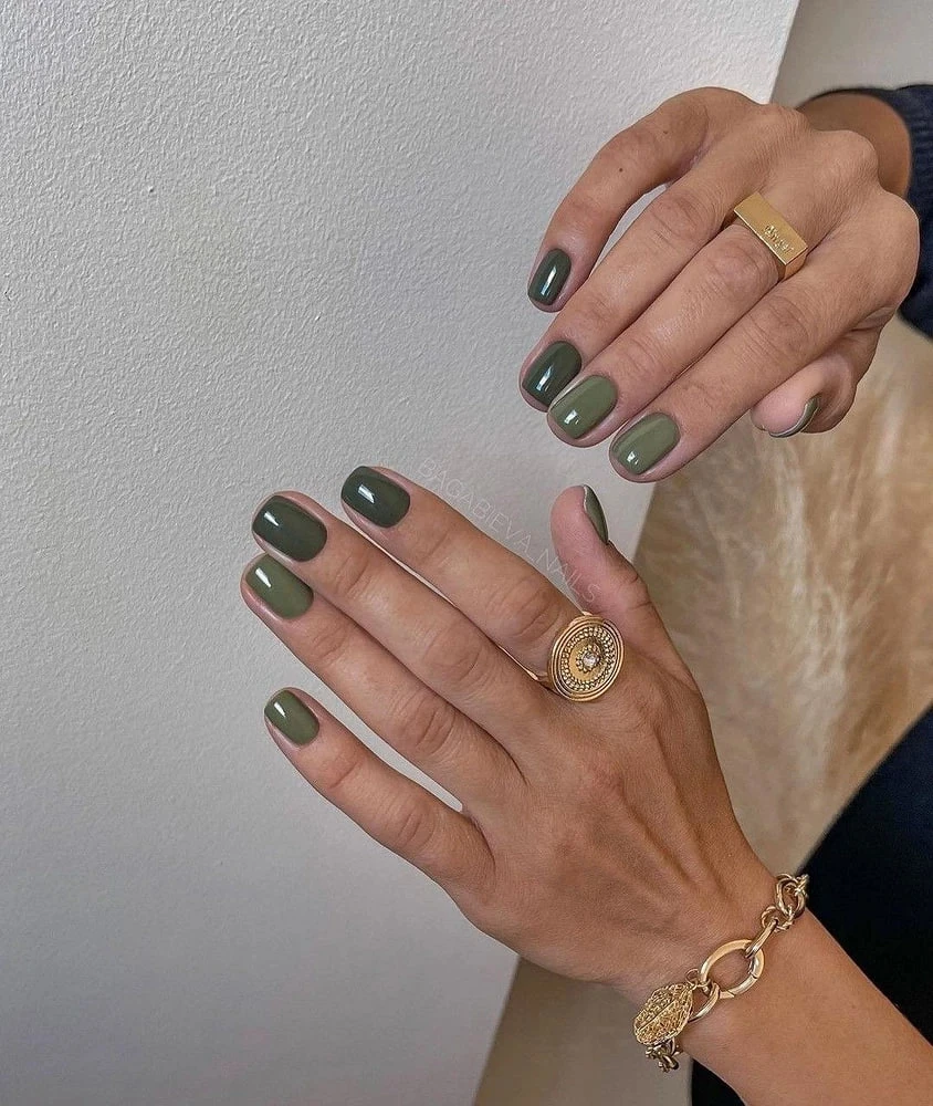 Оливковый — безоговорочный хит осени. Он ассоциируется с цветом долларовых купюр и работает по принципу «подобное притягивает подобное». Такой маникюр выглядит изысканно и универсально, подходя и блондинкам, и брюнеткам, и рыжеволосым.
